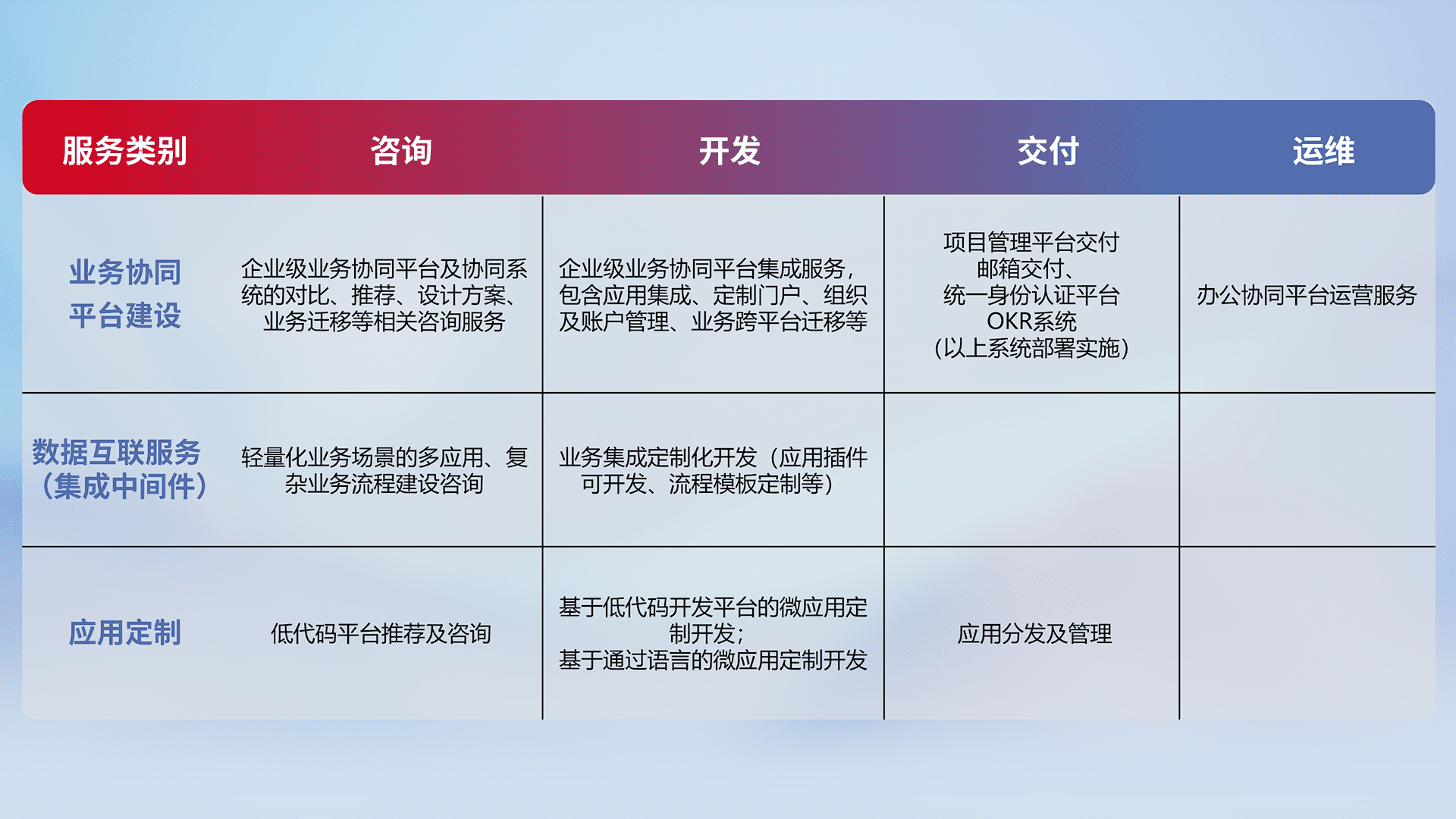 针对钉钉、、企微、、、、IDaas等平台级产品提供产品的规划、、方案、、、、交付、、、定制化开发等服务,,实现如统一协同办公、、、、智能客户服务、、混合会议管理、、智能数据查询、、、等业务场景,,实现数字化转型。。。